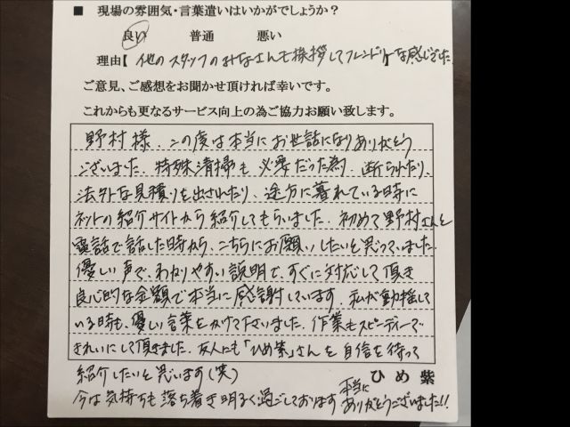 | お店の特徴 | お客様のお気持ちに寄り添い、親身になり作業をさせて頂きます。 身内の方がお亡くなりになられるという事は、精神的にもかなりの負担が掛かると思います、ましてや遺品の整理となると肉体的にも負担が掛かると思います。 その様な方が、当社とご縁があり係り少しでも精神的・肉体的な負担を取り除く事ができ、例え半歩でも前に進むお力になれたらと思っております。 |
